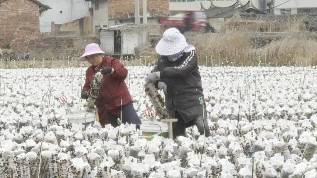 在元沙村黑木耳轻简化技术集成示范基地,村民们穿梭在菌棒间,将一朵朵鲜嫩的木耳小心采下,装筐、搬运,现场一派繁忙的丰收景象。